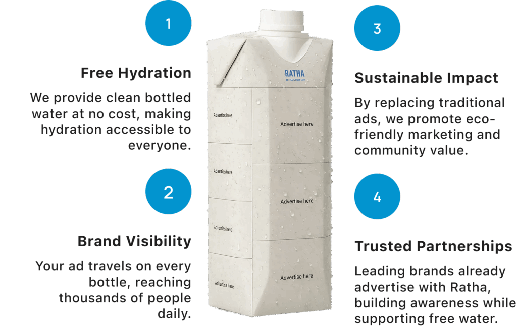 Ratha provides free bottled water funded by ads on its labels, turning each bottle into a platform for brand visibility. While advertisers gain reach, consumers enjoy clean water at no cost. With a focus on sustainability, wide distribution, and community trust, Ratha blends hydration with marketing innovation, positioning itself as a forward-thinking and socially responsible brand.